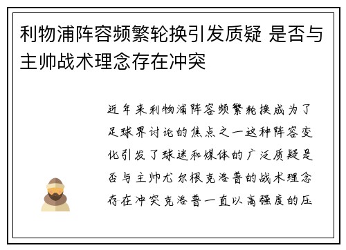 近年来,利物浦阵容频繁轮换成为了足球界讨论的焦点之一。这种阵容变化引发了球迷和媒体的广泛质疑:是否与主帅尤尔根·克洛普的战术理念存在冲突?克洛普一直以高强度的压迫式防守和快速反击为特点,强调团队的整体配合与稳定性。然而,频繁的阵容调整似乎与...