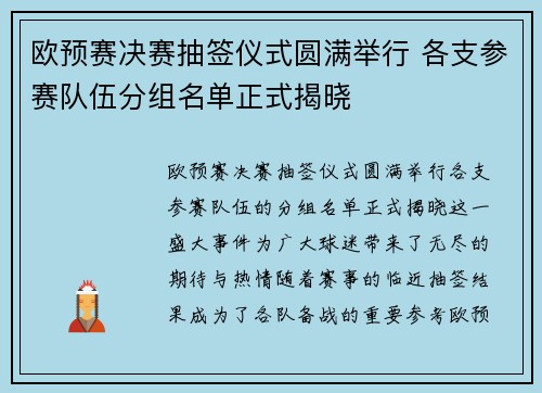 欧预赛决赛抽签仪式圆满举行,各支参赛队伍的分组名单正式揭晓,这一盛大事件为广大球迷带来了无尽的期待与热情。随着赛事的临近,抽签结果成为了各队备战的重要参考。欧预赛是欧洲顶级足球赛事的重要前奏,涉及到的球队既有历史悠久的强队,也有新兴崭露头角...
