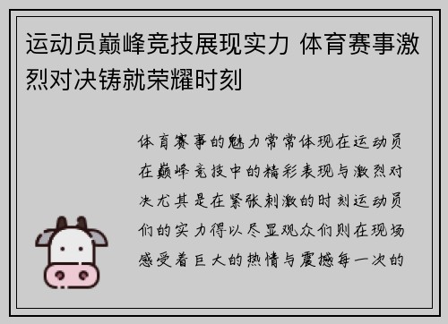 体育赛事的魅力常常体现在运动员在巅峰竞技中的精彩表现与激烈对决,尤其是在紧张刺激的时刻,运动员们的实力得以尽显,观众们则在现场感受着巨大的热情与震撼。每一次的荣耀时刻背后,都凝聚着无数的努力、付出和汗水。在赛场上,运动员们不单单是为个人的荣...