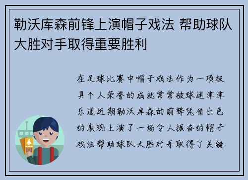 在足球比赛中,帽子戏法作为一项极具个人荣誉的成就,常常被球迷津津乐道。近期,勒沃库森的前锋凭借出色的表现,上演了一场令人振奋的帽子戏法,帮助球队大胜对手,取得了关键的胜利。这场比赛不仅展现了球员的个人才华,也体现了勒沃库森整体实力的提升。本...